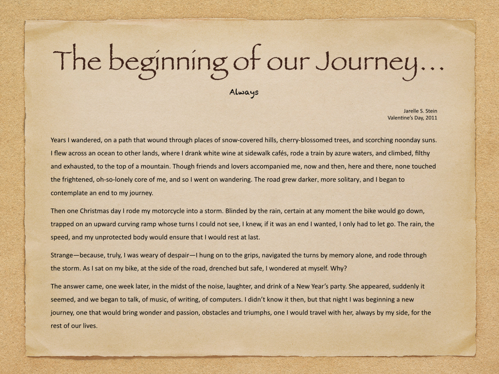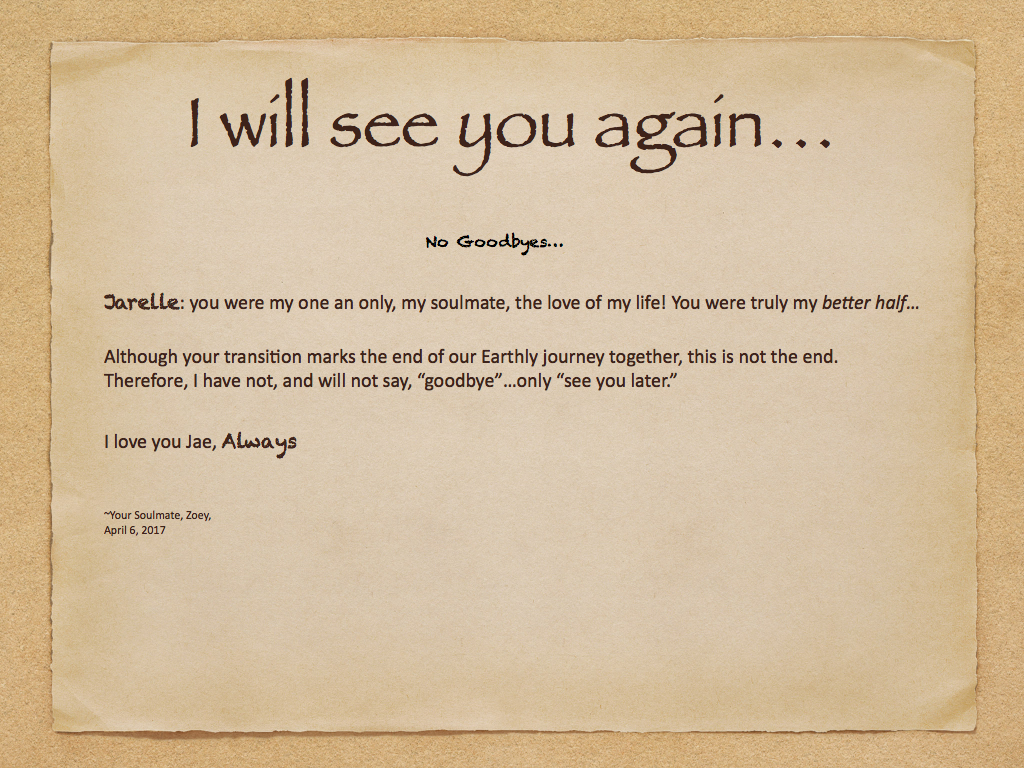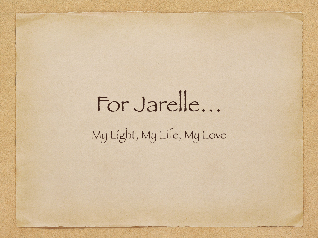 Jarelle: you the one I was destine to love... We shared so many, many things together: love of books and the written word, classic movies, timeless music, fine art, delicious cuisine, elegant wine, savoury spirits, a walk on the beach, new adventures, and an amazing romance!