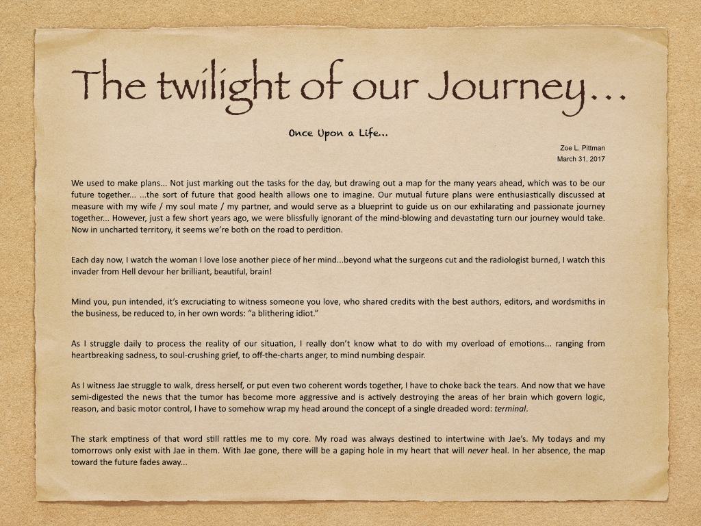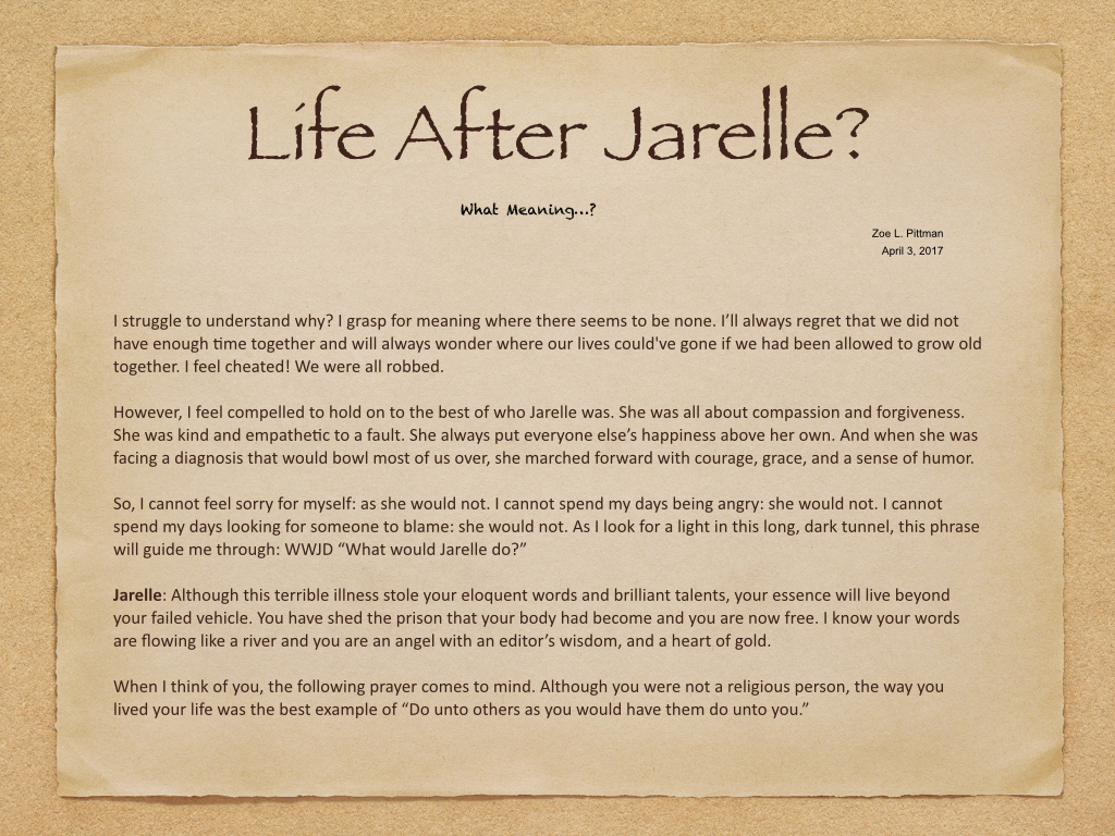 Jarelle's passing will also leave a huge hole in the lives of all those who loved her. She had the rarest of gifts: the ability to truly listen. This is what made her such an exceptional editor. She instinctively knew how to enhance a writers voice, but never step on it. Her gift of listening also made her a compassionate friend. Even as she was fighting a battle for her own life against a formidible foe: brain cancer, she always found time and energy to help family or friends who were in need. She was a gentle and kind soul. If it is possible to generate good karma for your next life, then she will come back as royalty.